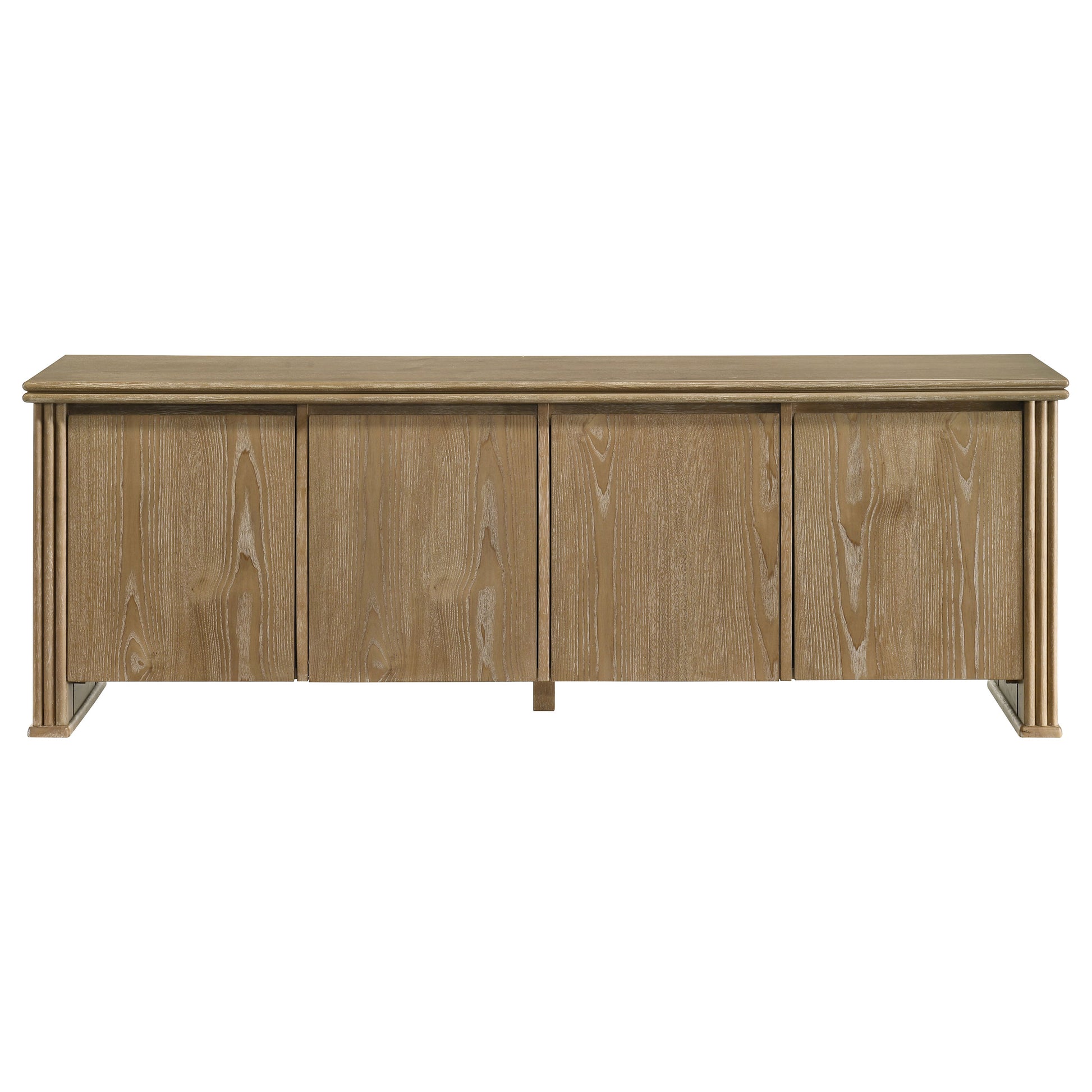This seventy-inch TV stand combines sculptural texture and functional storage for a grounded living room anchor. Four flat-panel doors conceal generous interior space, complete with adjust shelving and rear cable access cutouts for organized media setup. Vertical reeding along the sides adds visual rhythm to the clean-lined form, while a distressed light brown finish highlights the natural grain. Built from engineered wood and ash veneer, this media console offers both form and utility.