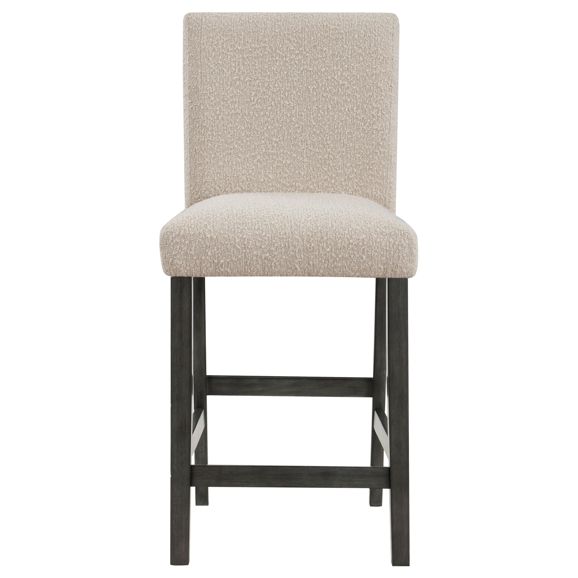 Elevate your dining experience with this chic counter height chair, a blend of simplicity and texture. Wrapped in the luxurious touch of boucle fabric, the chair offers a tactile feast, inviting guests to savor every second seated. Its silhouette stands tall on charcoal grey legs, a grounding finish that brings a sophisticated contrast to the chair's creamy hues. The understated elegance of this chair is a tribute to minimalist design, yet it hums with a warmth that enlivens any contemporary kitchen or bar area. It's where comfort meets style.