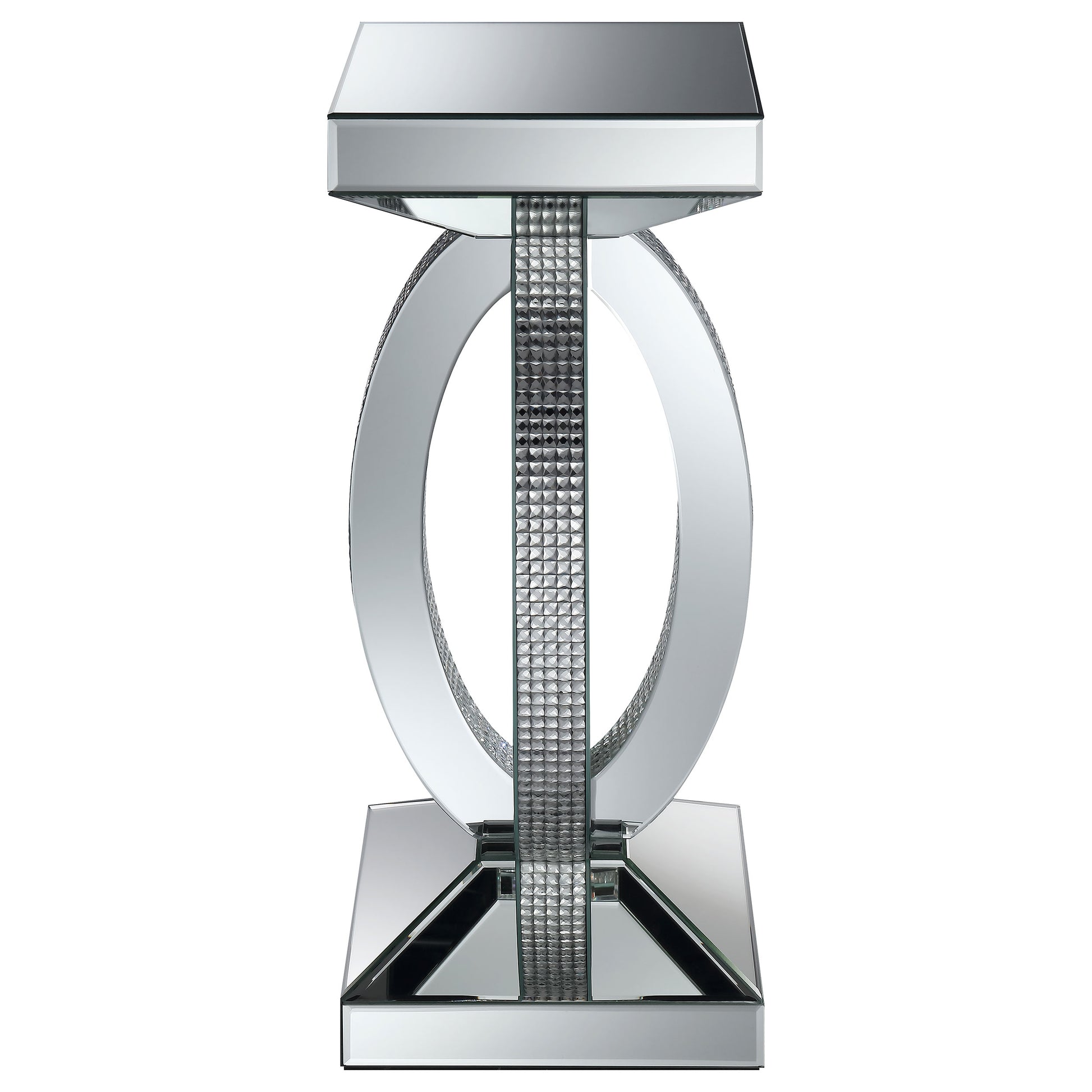 This chic and contemporary end table captivates with its sculptural, artistic design. Crafted with mirrored surfaces and engineered wood, it exudes modern luxury. The intersecting oval-shaped loops form a striking, three-dimensional silhouette, enhanced by sparkling rhinestone accents. A sturdy square base and tapered top complete the bold aesthetic, making it a glamorous centerpiece for any contemporary living space.