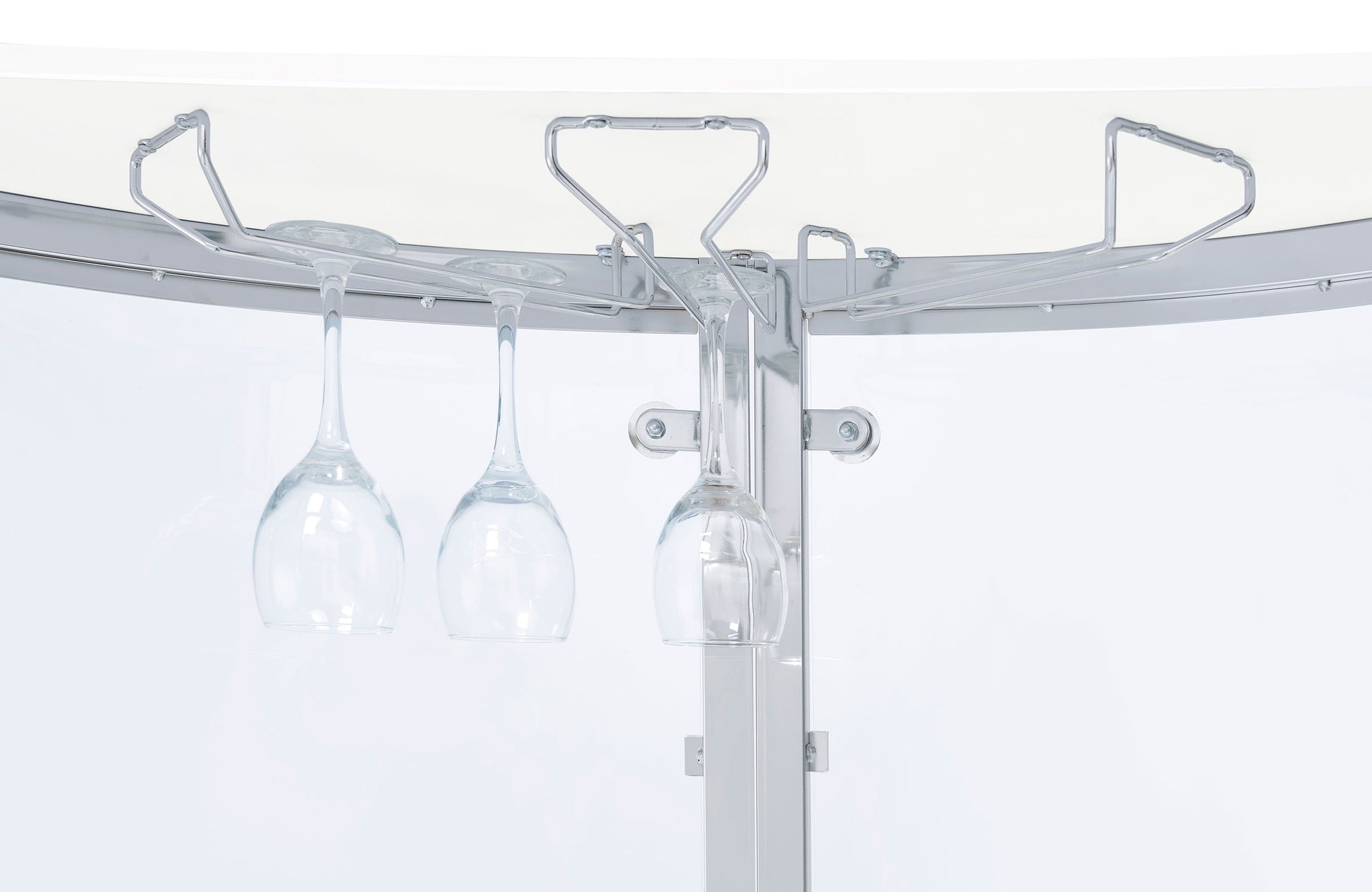 Upgrade your home entertainment options with this gorgeous, contemporary bar unit. With a convenient wine glass rack and ample storage space, it easily accommodates a wide variety of stemware, bar accessories, and cocktail ingredients. Graceful and glamorous, its curved silhouette is beautifully accentuated with gleaming chrome accents. A large, tempered glass top gives you plenty of prep space to mix delicious drinks for your guests. Complete with clear acrylic panels, this stylish unit allows you to show off your collection of fine wines and spirits in style.