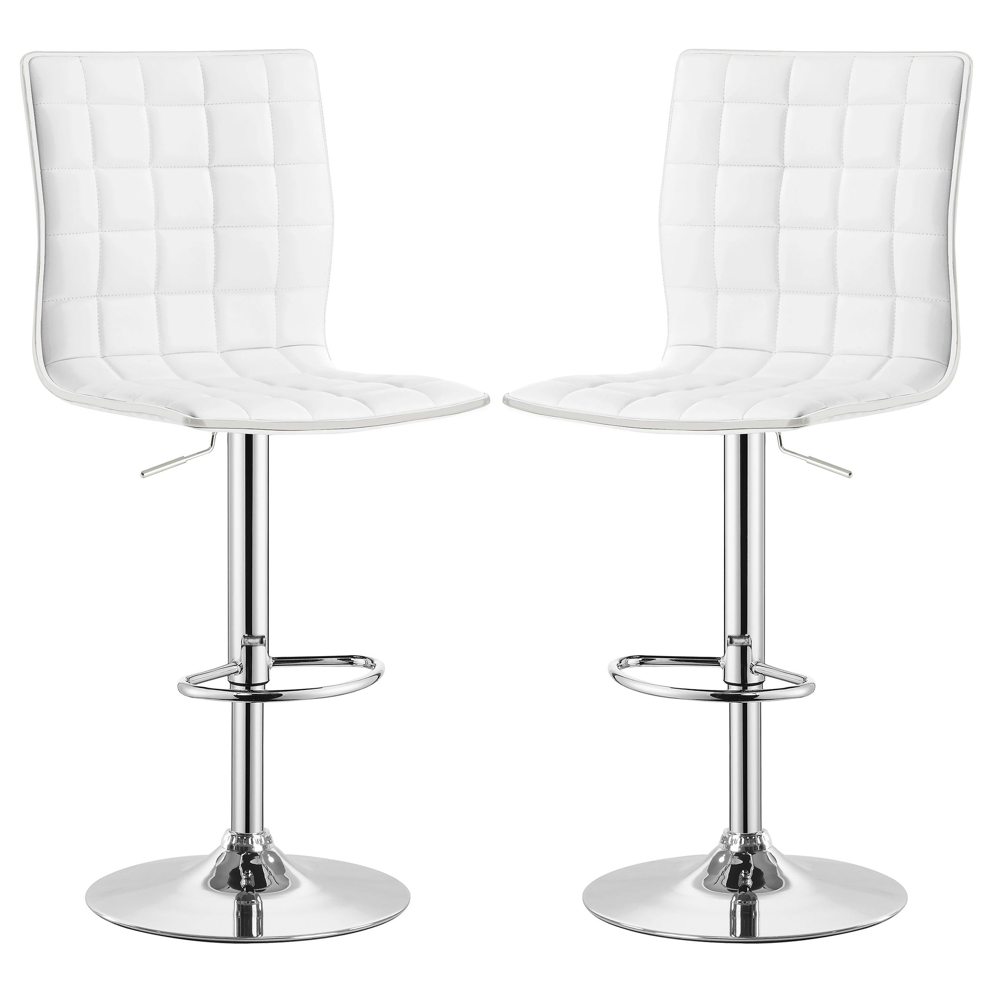 Gleaming chrome accentuates the clean, modern silhouette of this adjustable barstool. Its armless seat boasts a full back with waffle texturing created with intersecting lines for a dimensional look. Delivering appealing comfort, the barstool includes a height adjustable seat that accommodates various counters and bar tables. Cool white upholstery with a leather-like look reinforces a clean, contemporary profile. A pedestal base shows off a gleaming chrome finish and includes a built-in footrest for optimal comfort.