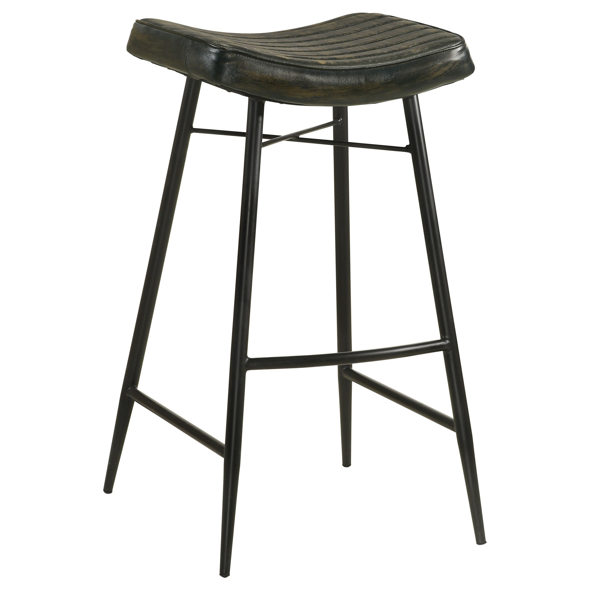 Inject a heavy dose of casual character to your kitchen or bar with the rich antiqued leather upholstery featured on a classic backless stool. Its gently curved seat cradles you in comfort, with channel tufting that adds texture and compelling style. A durable metal base delivers stability for all your seating needs, from a quick cup of coffee in the morning to a leisurely dinner catching up with your favorite person. Flared legs define its silhouette, with an X-cross brace just under the seat adding visual interest and depth. Gently curved footrests and built into the base, perfect for support and style for the whole family.
