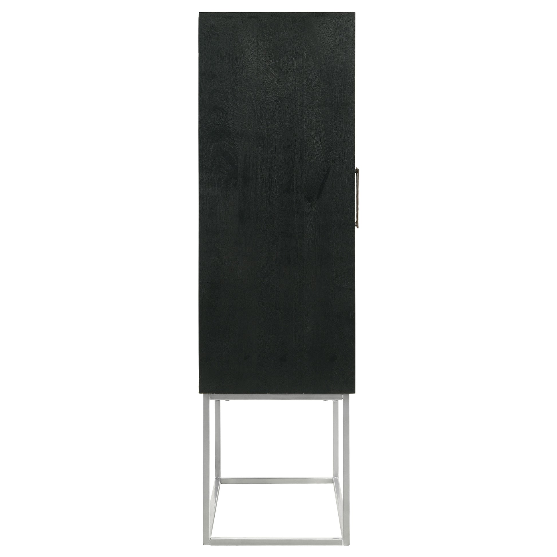 Get the party started with a sophisticated, contemporary bar cabinet. Closed, it's simply a stylish cabinet, complete with decorative checkerboard door fronts and geometric handles that catch the eye in a living or dining room. When opened, the cabinet reveal plenty of space for all your wine and cocktail needs, complete with two interior shelves to keep everything at your fingertips. The cabinet is crafted from mango wood, with a warm walnut finish on its doors and a black case finish. The cabinet is elevated on an iron base that receives a classic silver finish, delivering height and lightness to the overall look of the piece.
