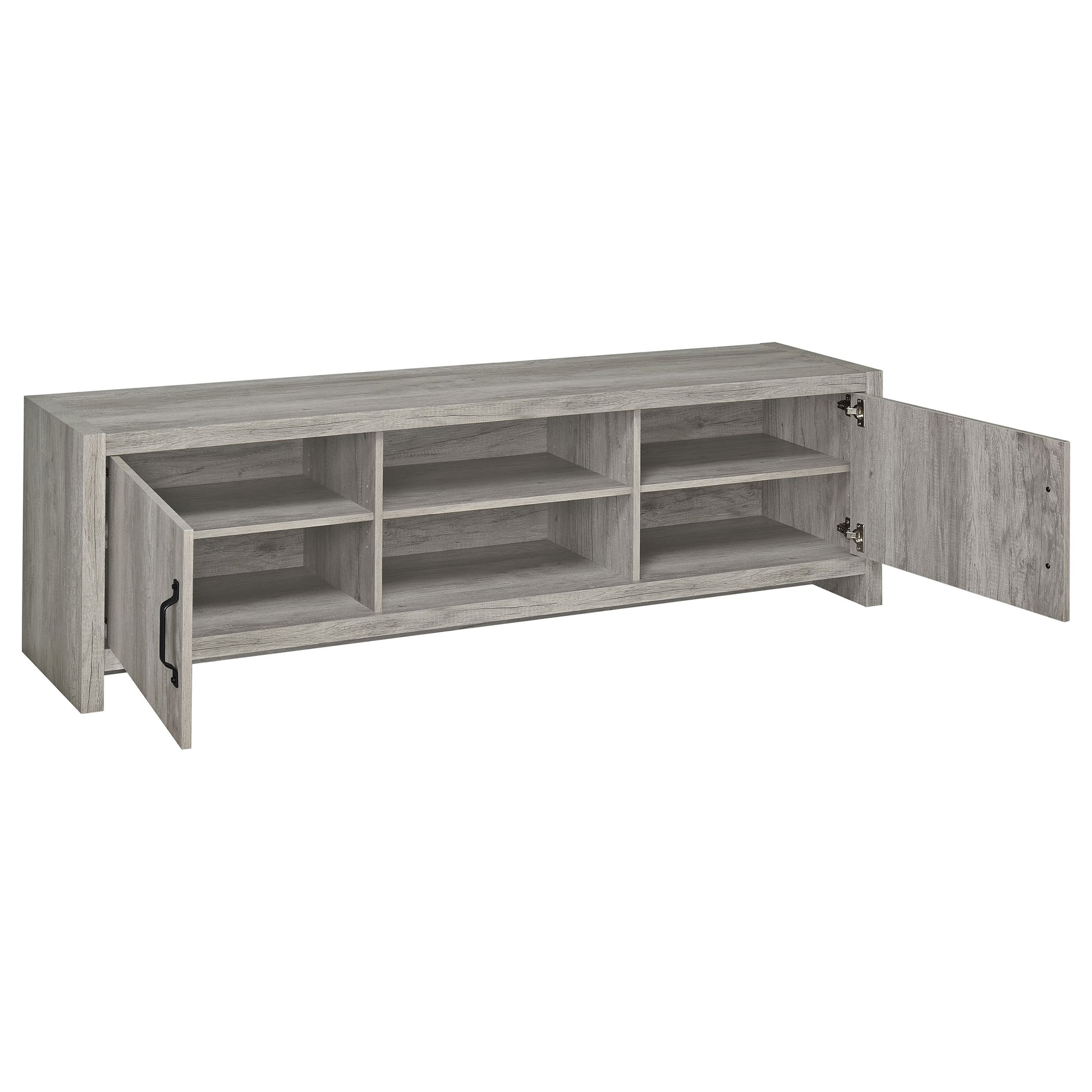 Add modern sophistication to your living space with this 71-inch TV stand in a light grey driftwood finish. Designed to accommodate TVs up to 75 inches, it features a clean, linear silhouette that blends seamlessly with contemporary décor. Two side cabinets with adjustable shelves provide concealed storage for accessories, while open center shelving keeps media components organized. Crafted from engineered wood with a durable laminate veneer, this console offers both everyday function and refined style.