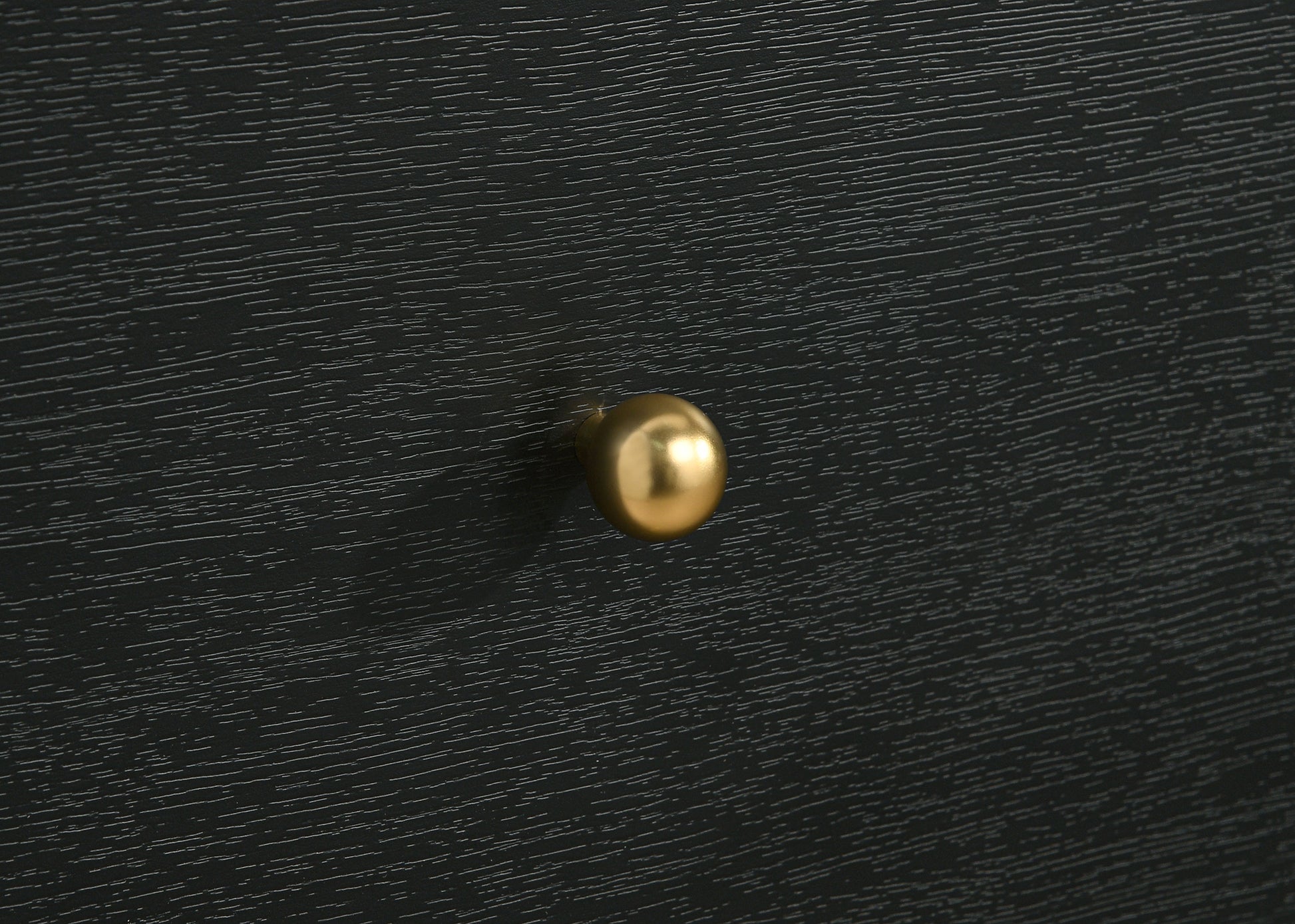 Complement a stylish bedroom with the abundant storage featured in a modern six-drawer dresser. Delivering a sophisticated presentation, it boasts a black finish over melamine surfaces that resist damage to remain looking their best. Ball knobs complement each drawer front, standing out with a rich, warm brass finish. The case of the dresser features rounded corners, softening the overall presentation of the dresser. A wide top is ideal for jewelry boxes and decor that lends a personalized touch.