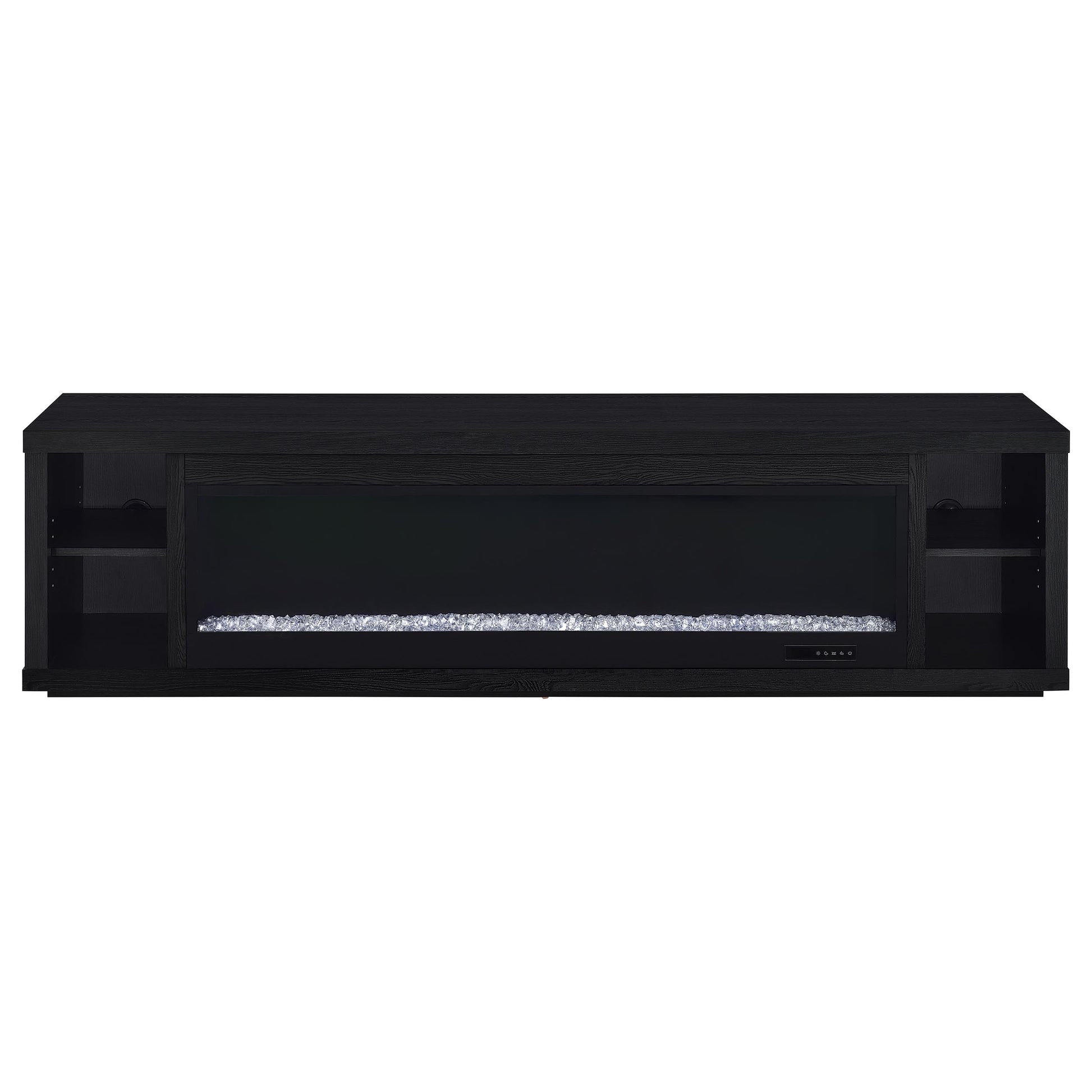 This sleek fireplace media console brings warmth and streamlined storage to contemporary living spaces. A wide electric firebox glows over crushed acrylic crystals, offering fifteen customizable flame colors operated by a wireless remote. Open side compartments with adjustable shelves store devices or décor, while rear cable management cutouts keep wires out of sight. Finished in classic black and crafted from engineered wood with a laminate veneer, it serves as a refined TV stand or entertainment center. Please note that this console does not include a heat function.