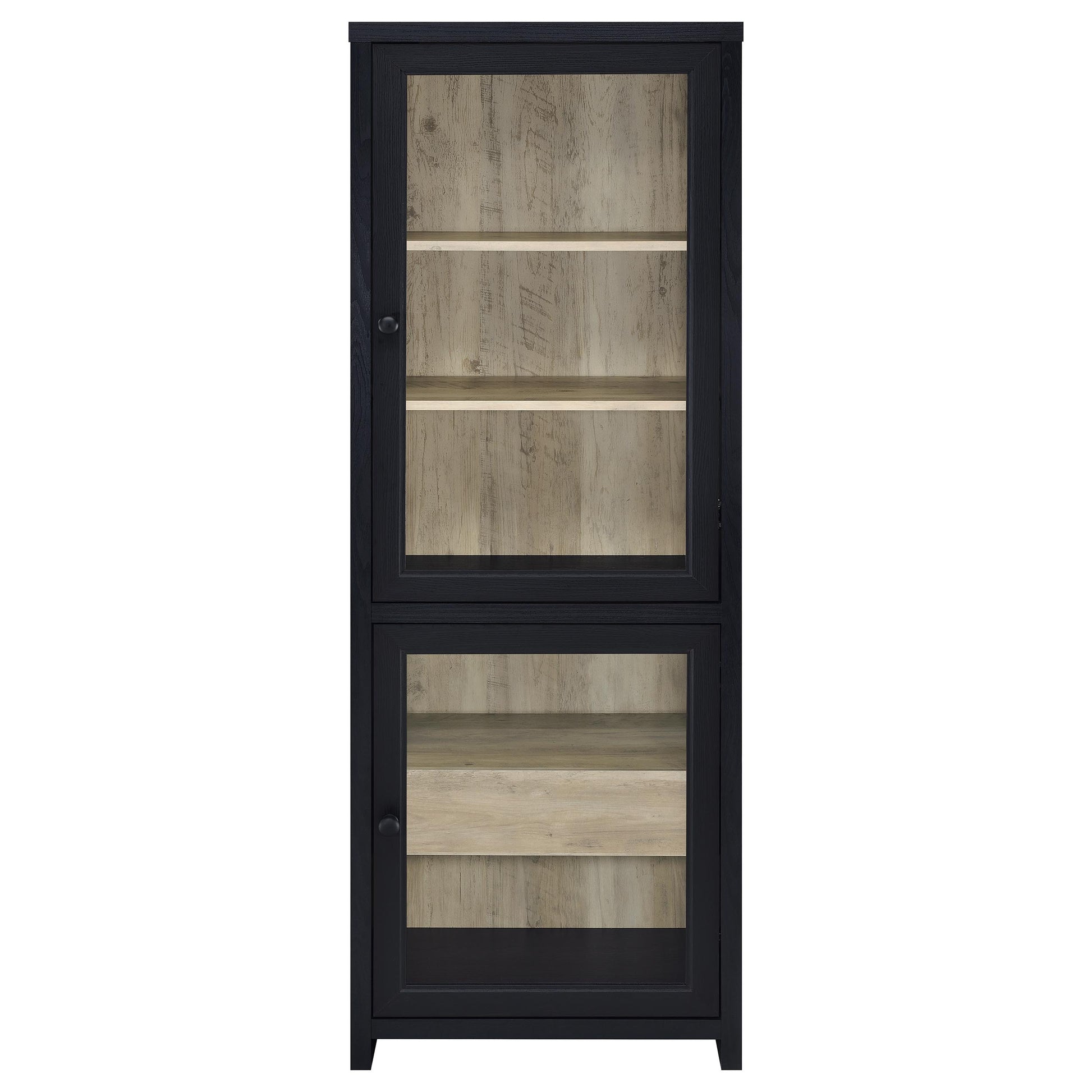This three-piece entertainment center brings bold character and quiet refinement to the modern living room. Framed in matte black with framed glass doors and a natural wood-look interior, it offers a striking contrast that feels both grounded and elegant. Adjustable shelving provides room to display, while hidden drawers and cabinets keep everyday items tucked neatly away. With its tall, architectural profile and warm two-tone finish, this ensemble transforms your media setup into a curated focal point.