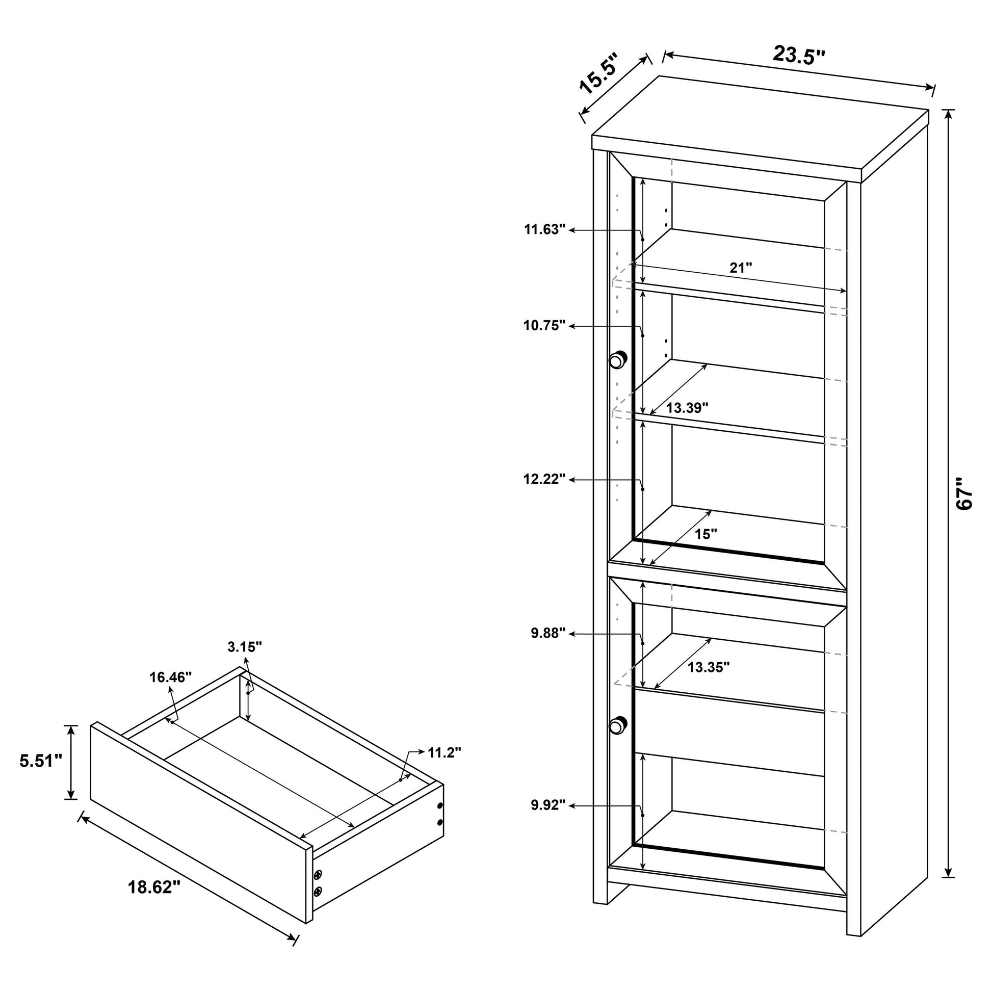 • Tall cabinets include adjustable upper shelves ideal for display or media storage