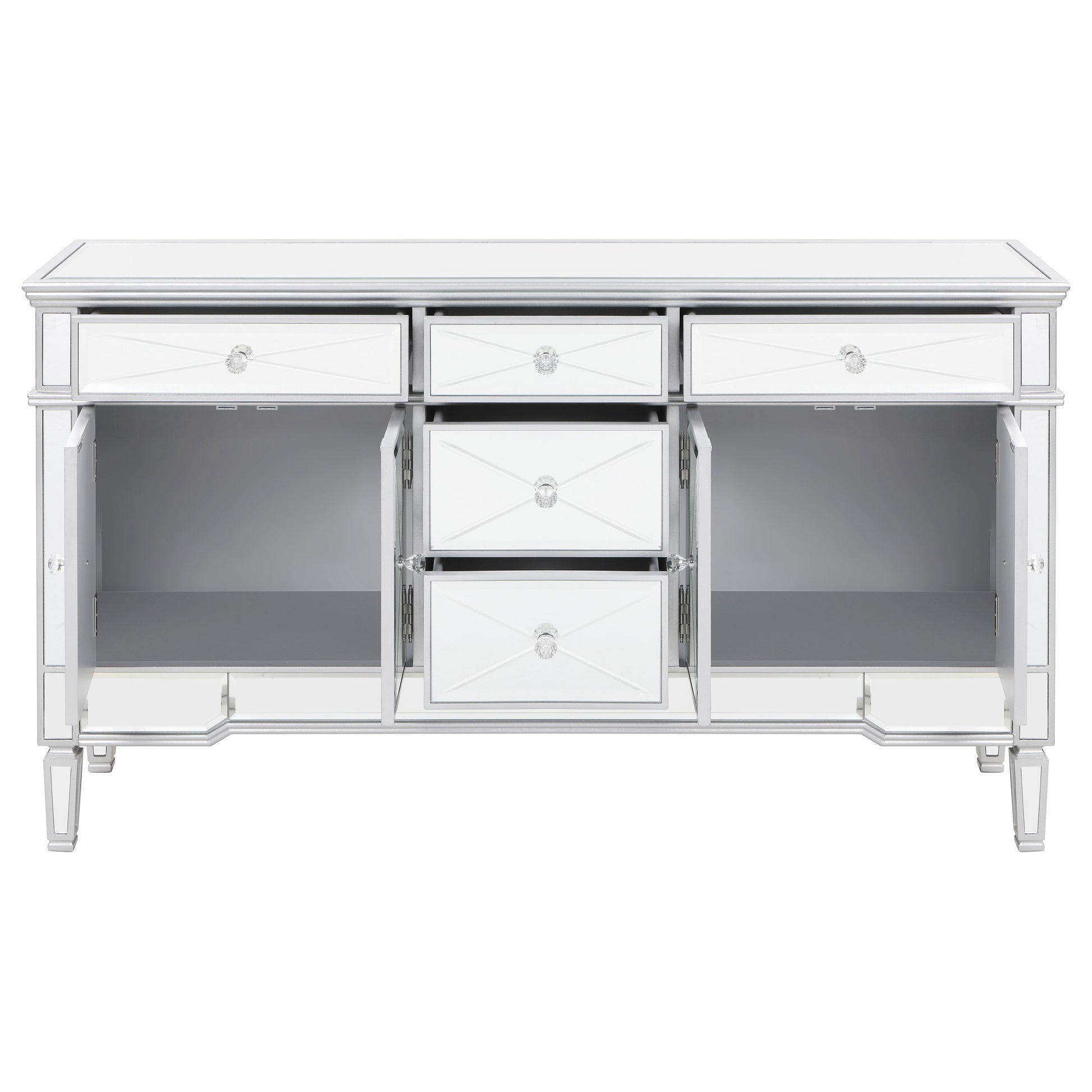 This mirrored accent cabinet has plenty of storage and panache. Fashioned from a combination of materials, it brings modern appeal and convenience to the home. It features birchwood and MDF construction in a silver finish to match the lustrous mirrored accents. Nine mirrored drawers with crystal hardware feature plenty of storage capabilities for all your needs. It's a fine addition to a modern styled living room or entertainment room.