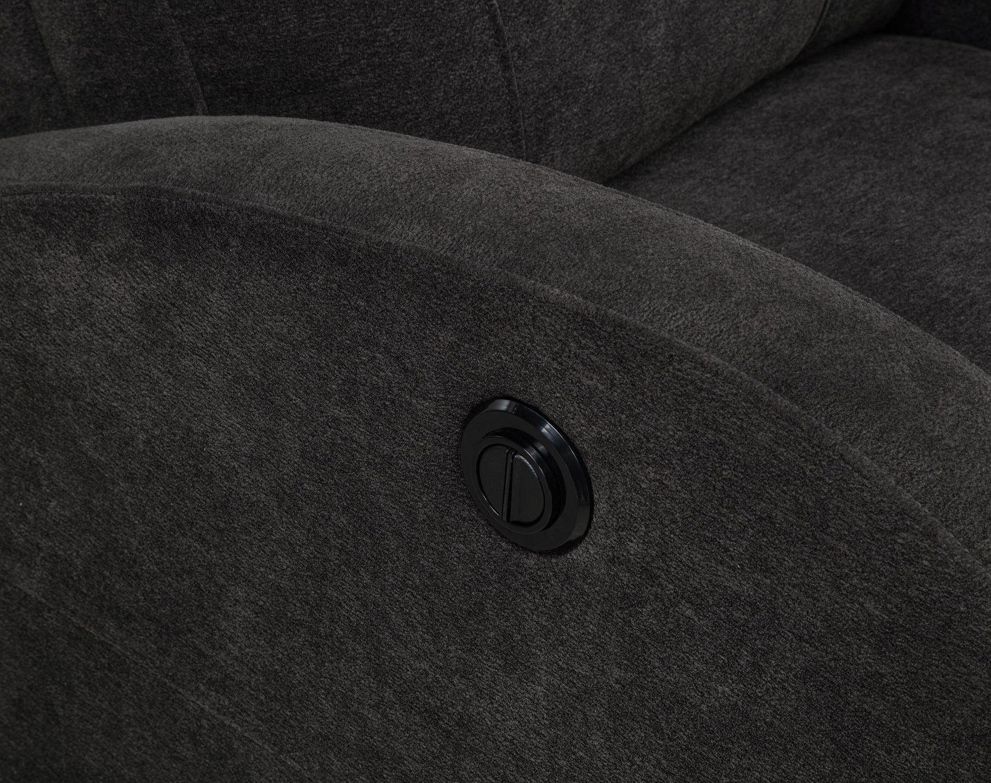 Designed for quiet evenings and effortless relaxation, this power recliner pairs plush support with modern ease. The charcoal grey fabric upholstery offers a soft, textured hand, while its smooth power reclining mechanism lets you ease back at the touch of a button. Gently curved arms, subtle topstitching, and a compact frame create a versatile silhouette ideal for smaller spaces. Perfect for reading, resting, or unwinding, this recliner delivers comfort with contemporary simplicity.