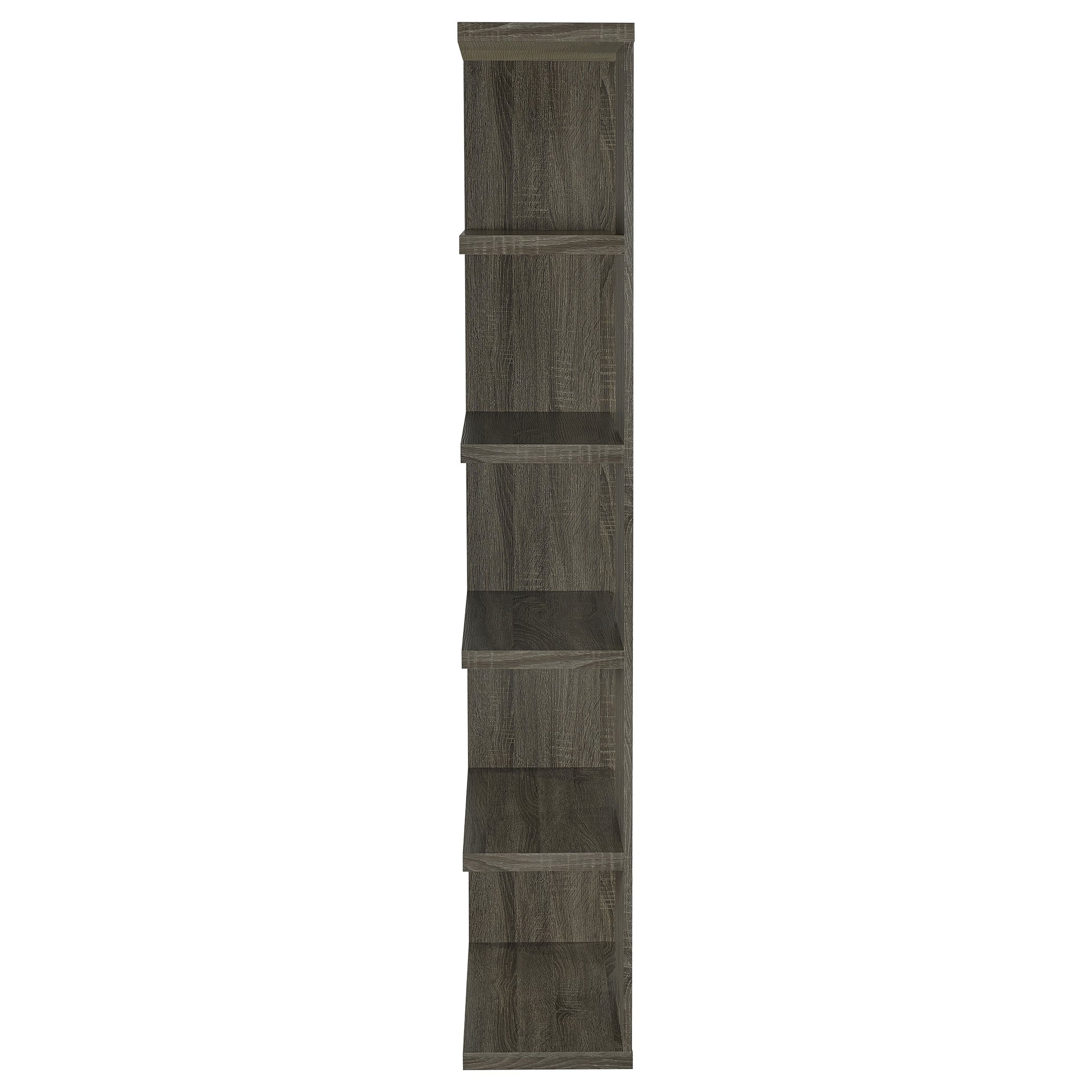 Add a touch of modern charm to any room with this stylish bookshelf in a weathered grey finish. Designed with a mix of open and backed shelving, it brings visual intrigue and versatility to your storage needs. Crafted from engineered wood and finished in eco-friendly melamine veneer, this unit offers five spacious tiers perfect for books, décor, and keepsakes in a contemporary home office or living space.