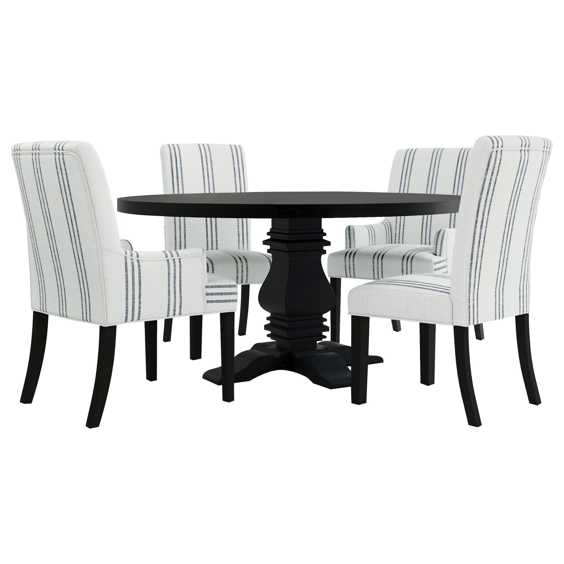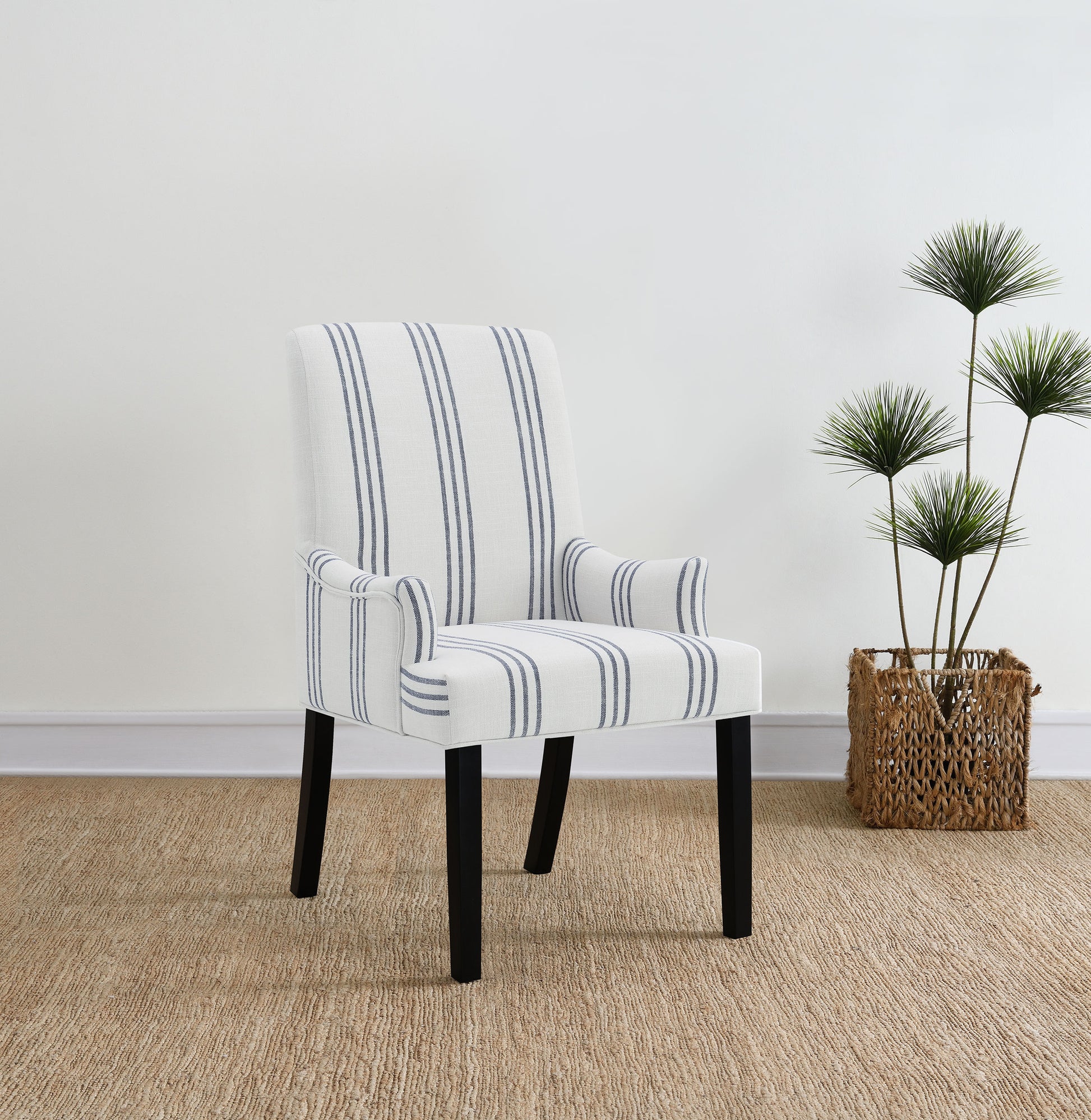 This armchair adds a refined yet relaxed charm to your dining space, blending comfort with casual elegance. Upholstered in linen-like beige fabric with blue stripes, it offers a timeless aesthetic. The padded seat, backrest, and gracefully curved arms ensure both comfort and style. Built with a sturdy rubberwood frame and a sleek black finish, this armchair provides lasting durability. Its versatile design works beautifully in transitional, modern, or farmhouse-inspired interiors.