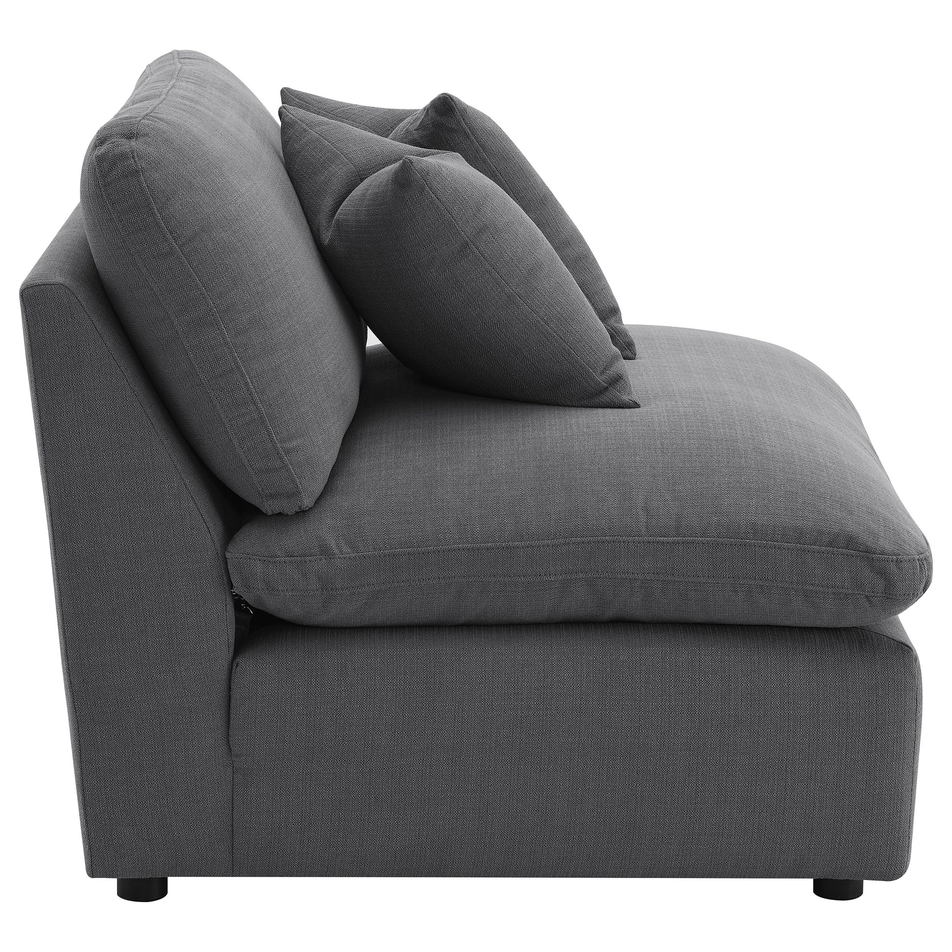 This armless chair combines plush cushioning with versatile design, making it a stylish and comfortable addition to any living room. Upholstered in soft fabric, it offers a supportive seat and back for everyday lounging. Clean lines and tailored topstitching create a contemporary look, while treated upholstery resists moisture for easier cleanup and long-lasting appeal. With its refined silhouette and cozy construction, this chair brings both comfort and style to your home.