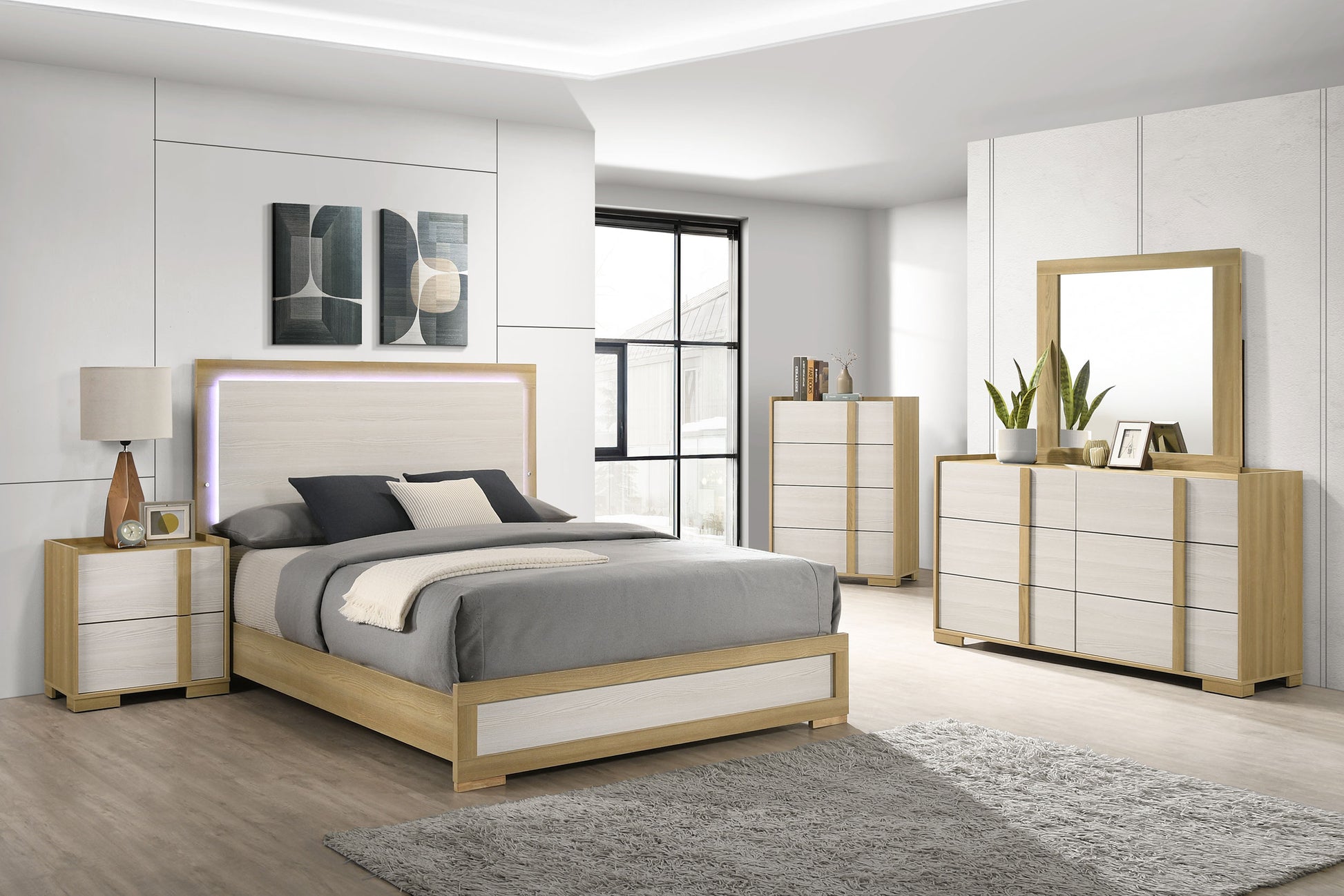 Elevate your bedroom decor with this stunning dresser and mirror set, combining contemporary elegance with functional design. Inspired by modern Italian aesthetics, this set features a sleek dresser with six spacious drawers and a matching mirror, both crafted from durable, easy-care melamine in a sophisticated blend of natural wood tones and crisp white panels. The dresser’s drawers, equipped with metal extension glides and pin-construction joinery, offer smooth operation and ample storage for your clothing and accessories. The minimalist mirror enhances the overall aesthetic, reflecting light and adding depth to your space. Transform your bedroom into a serene retreat with this harmonious and stylish dresser and mirror set.
