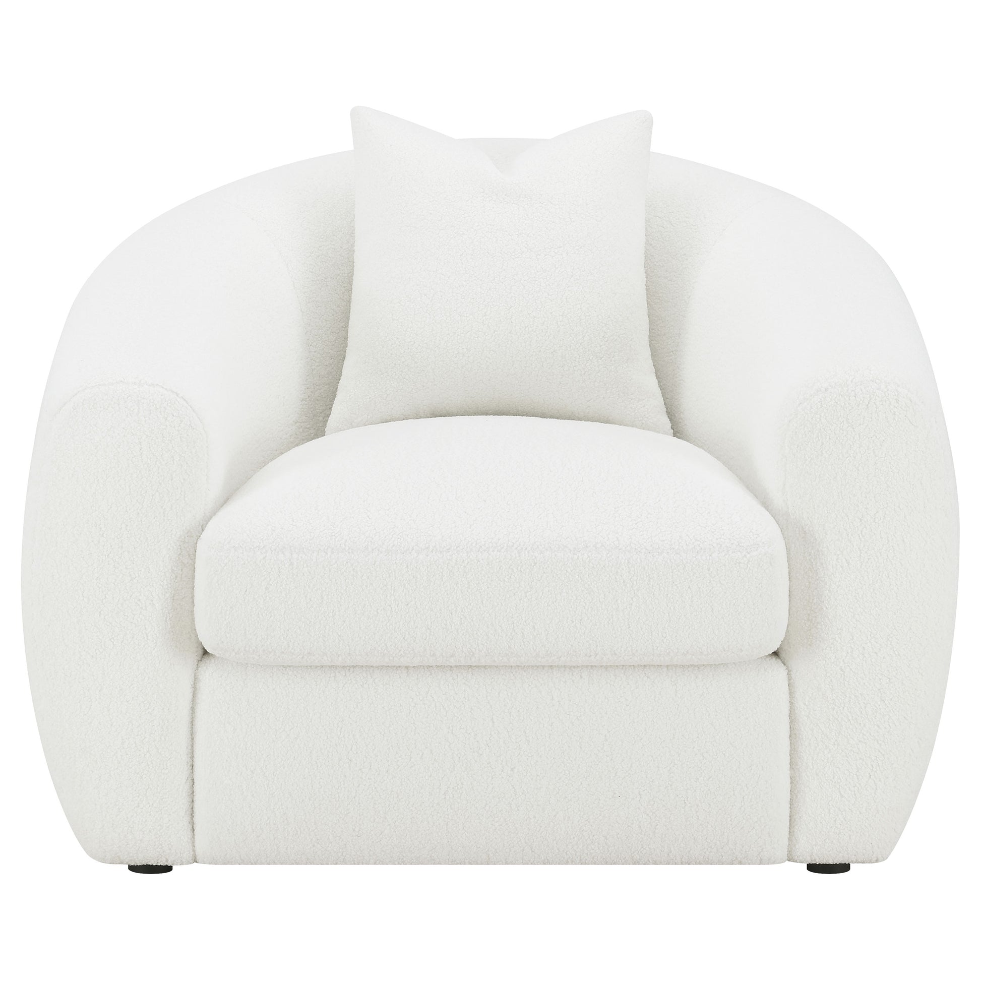 Add inviting elegance to your space with this contemporary accent chair upholstered in soft faux sheepskin boucle fabric. Its smooth curved frame and sloped armrests create a sculptural, cloud-like silhouette that enhances any modern interior. A plush seat cushion offers comfort and support, while the tight back keeps its refined shape. Finished with subtle black legs for gentle contrast, this chair includes a matching faux down accent pillow for an extra touch of coziness and sophistication.