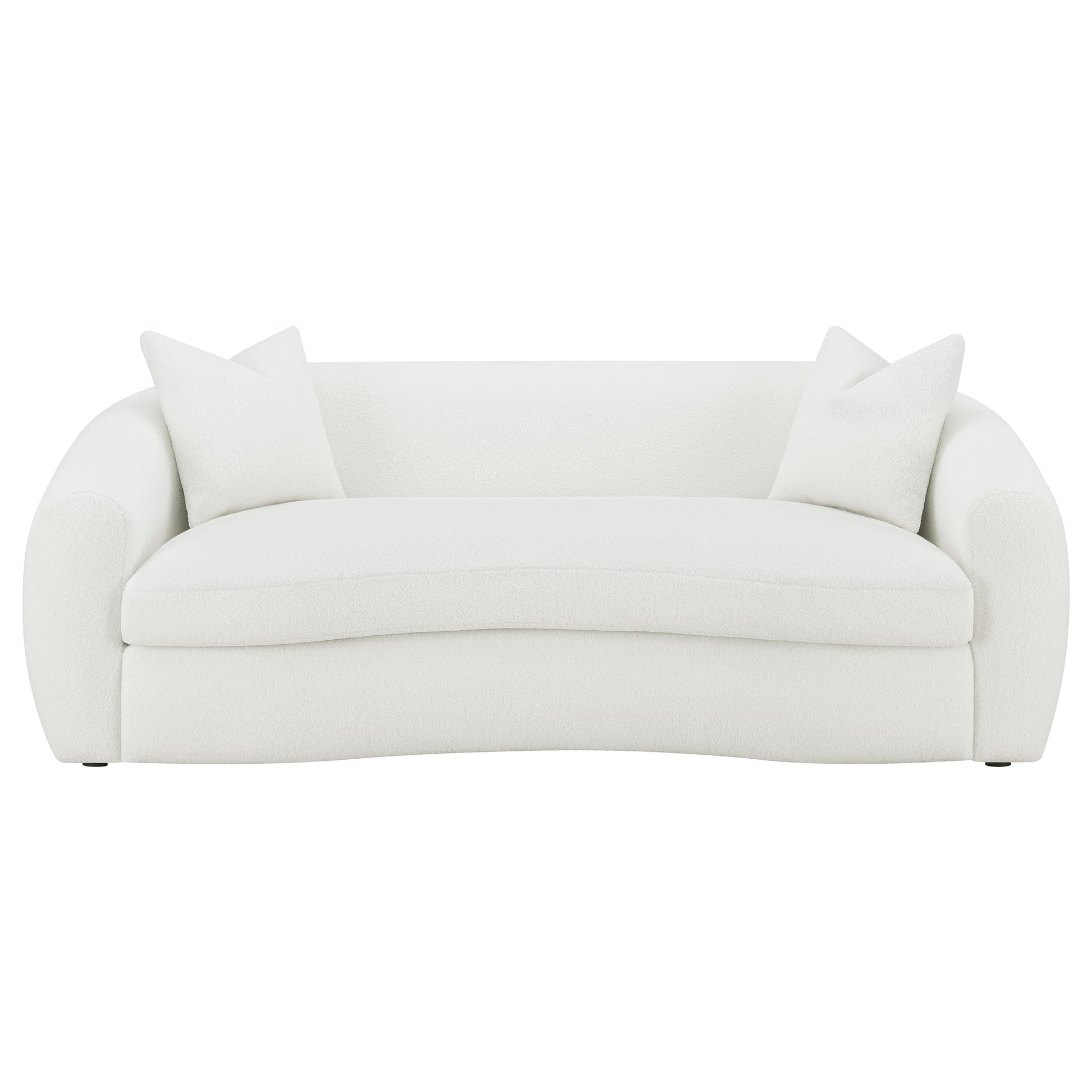 Bring modern warmth and soft texture to your home with this elegantly curved sofa. Upholstered in a plush faux sheepskin boucle fabric, it features smooth contours and sloped armrests that create a sculptural, contemporary silhouette. The tight back and plush bench seat provide comfort and support, while matching accent pillows filled with faux down add cozy refinement. Perfect for living spaces that blend modern design with inviting comfort, this sofa offers timeless style and everyday luxury.
