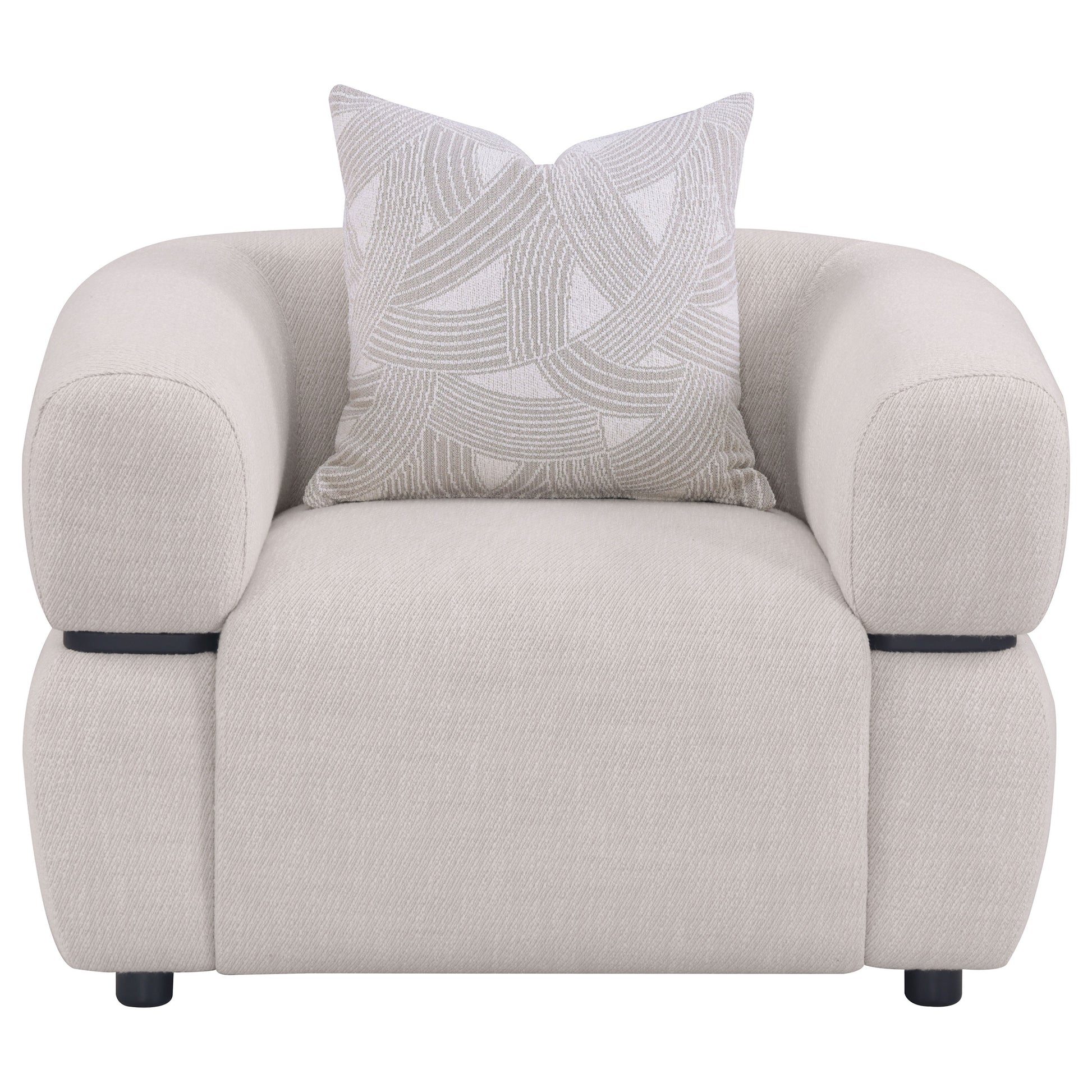 • Generously scaled accent chair in beige finish with wide curved arms and sculptural silhouette