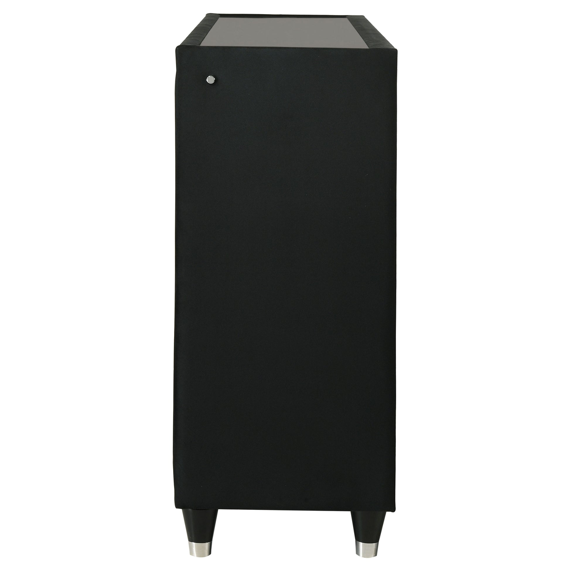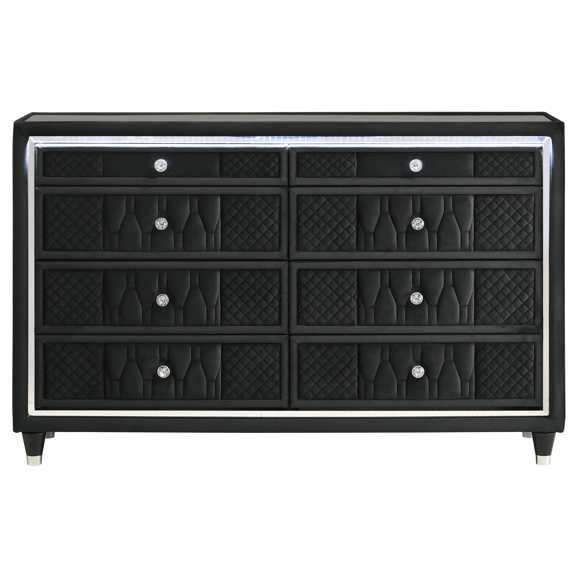Wrapped in sumptuous black velvet, this eight-drawer dresser exudes soft luxury with functional brilliance. Reflective acrylic accents, crystal knobs, and quilted fronts enrich each drawer, while LED trim and a clear tempered glass top add a luminous, polished finish. Solid rubberwood legs elevate the profile, and black felt-lined top drawers, dovetail joinery, and metal extension glides ensure enduring performance and elegance.
