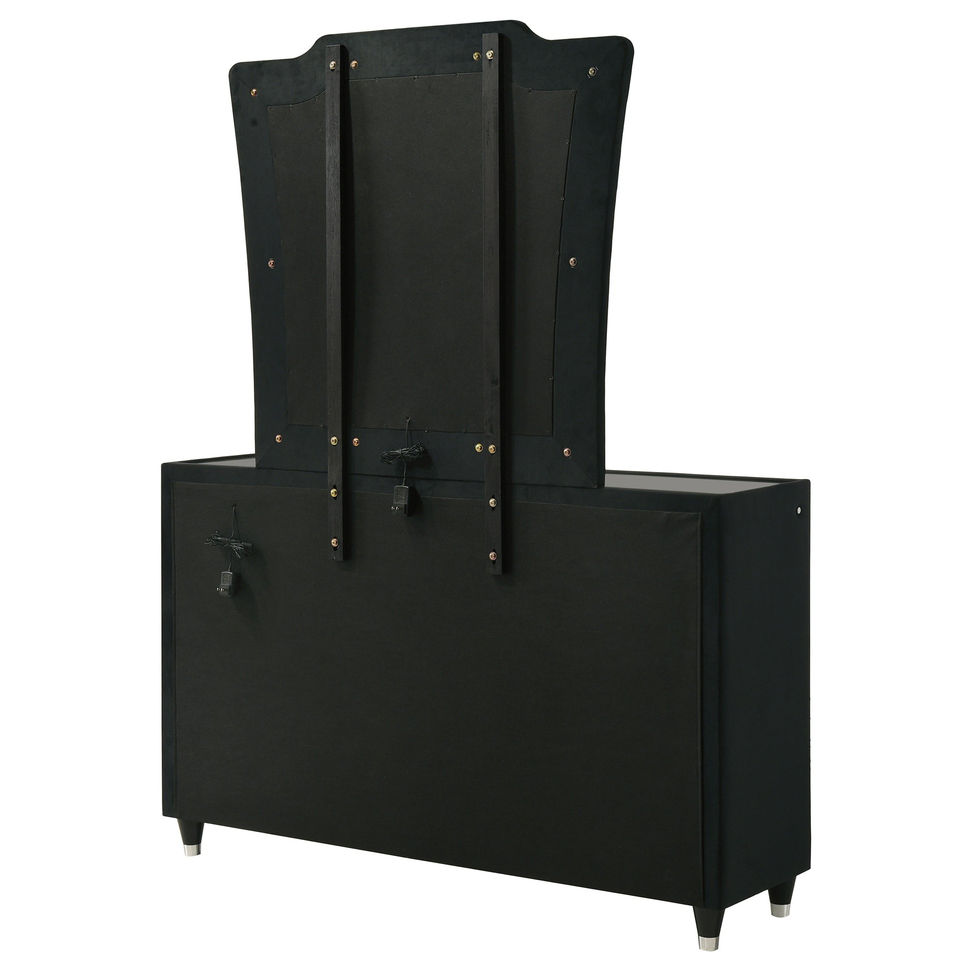 This dresser and mirror set blends soft velvet textures with luminous design for a refined bedroom statement. Fully wrapped in a black velvet, the eight-drawer dresser features a clear tempered glass top, LED trim, crystal knobs, and reflective acrylic touches. Above, the tri-panel mirror offers LED lighting and velvet framing. With felt-lined drawers, dovetail joints, and solid rubberwood legs, this set balances elegance with enduring practicality.