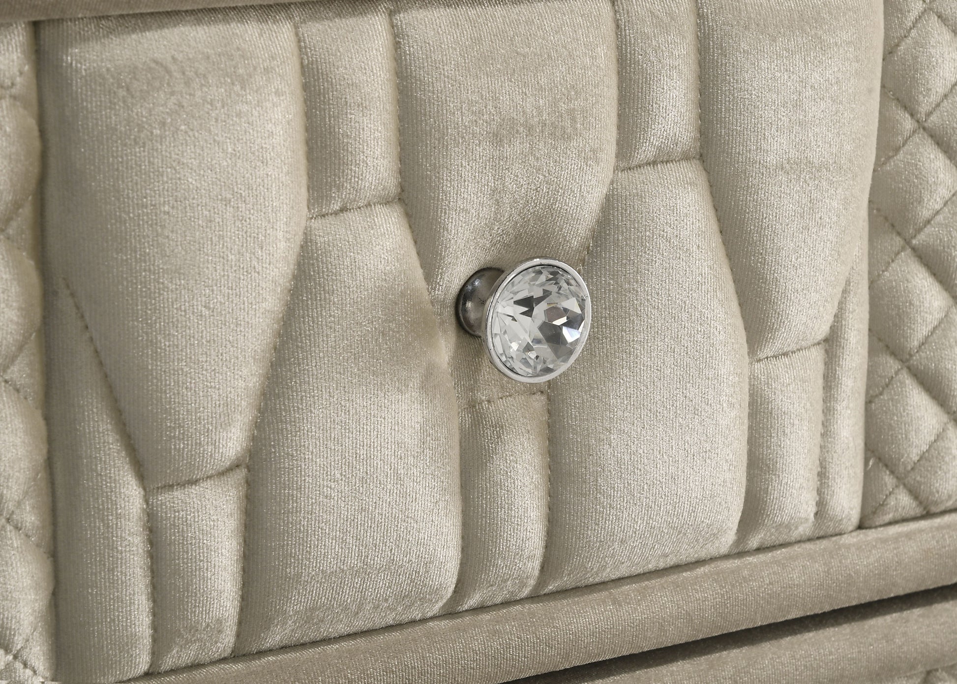 • Eight drawers with quilted fronts, crystal knobs, and reflective acrylic detail