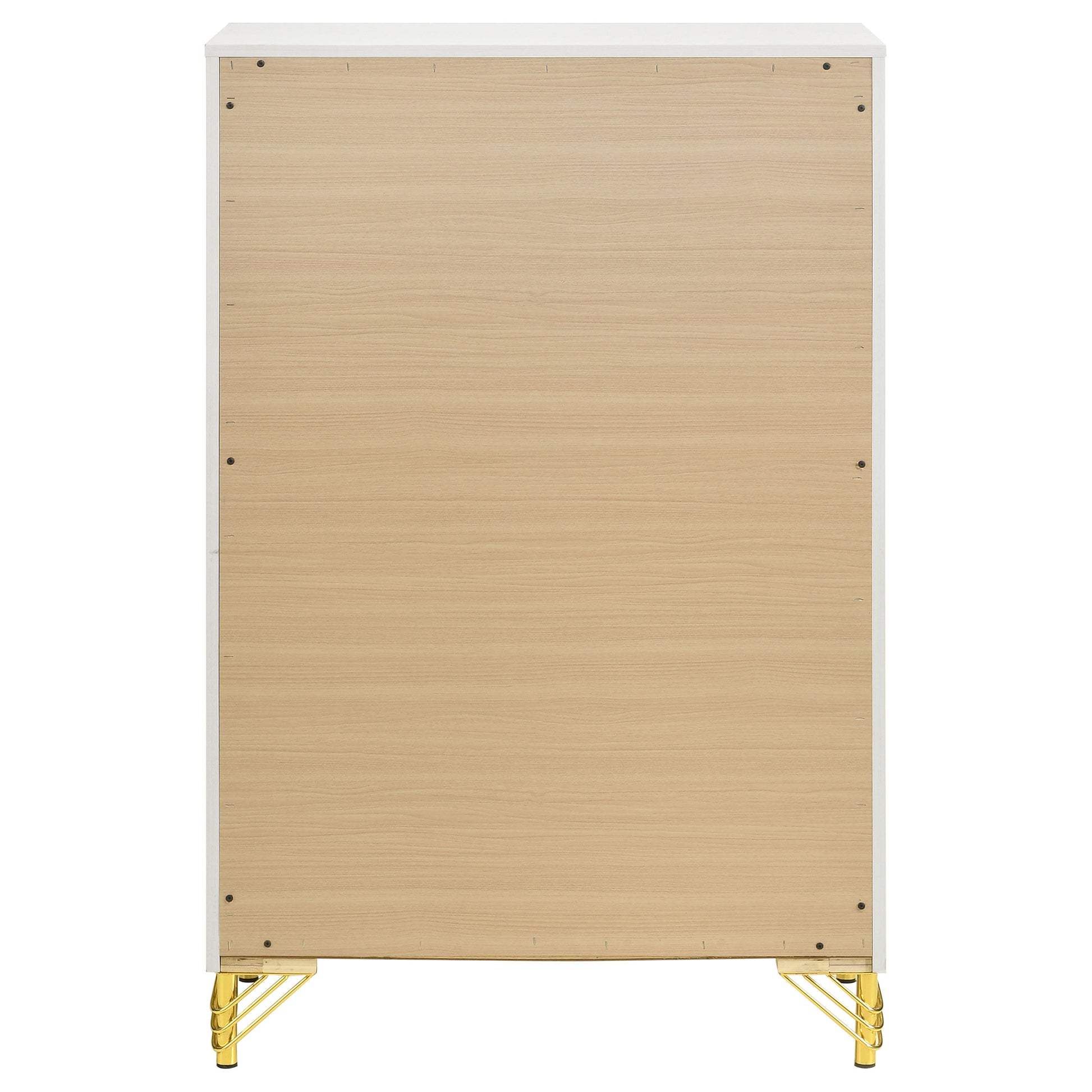 Inspired vintage touches create a refined sensibility for a modern five-drawer chest. Its tall, compact profile is ideal for a dressing area, offering plenty of storage with five roomy drawers that host everything from clothing and accessories to linens and other personal effects. The chest shows off a bright white finish, complete with gleaming gold trim that adds warmth and elegance. Its long bar drawer pulls add character, while hair pin inspired legs bring retro glamour and sophistication. Add decor to the top for a personal touch in your bedroom.