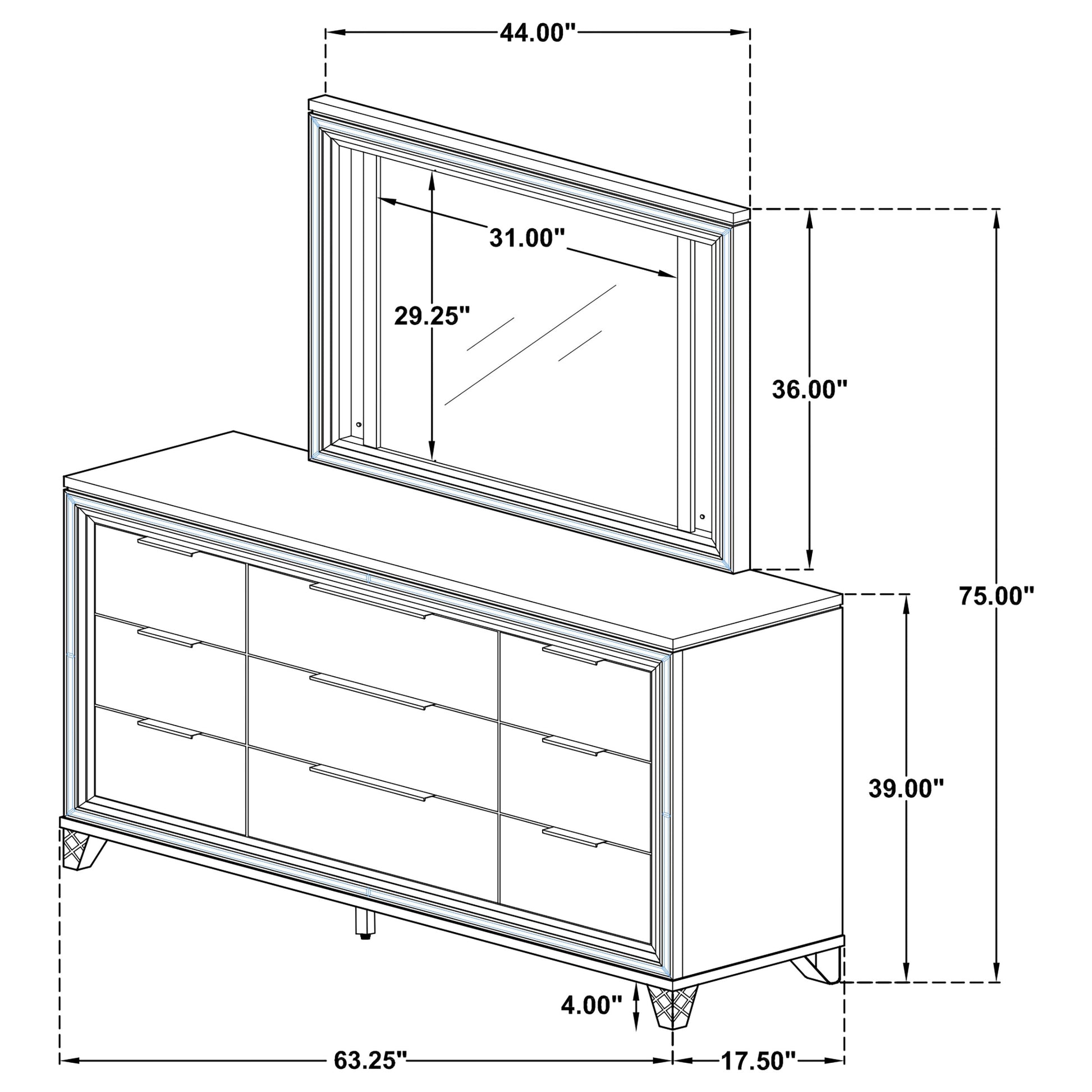 Elevate your bedroom decor with this stunning dresser and mirror set, featuring a modern Italian design with a striking white finish. The dresser offers ample storage with nine drawers, picture framed recessed panels, and embossed herringbone graphic patterns, while the mirror adds a touch of sophistication with its mirror framing and touch LED light. Accented with polished chrome metal hardware and acrylic legs, this set combines style and functionality. Crafted from rubberwood, MDF, and mirror, this dresser and mirror set is a perfect addition to your luxurious bedroom.
