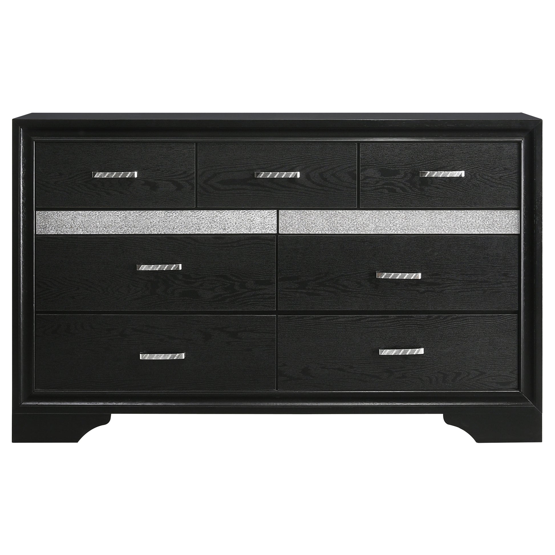 Glittering trim and a black finish create a sense of sophistication for a four-piece modern bedroom set. Designed to make a statement, the set focuses on a bed that boasts a crisp, clean-lined silhouette that pairs a rectangular headboard with padded black upholstery. Glittering diamond-like trim adorns the head and footboards of the bed and makes a statement on both the nightstand and dresser. Drawers are accentuated with jewelry inspired bar pulls that add to a gleaming presentation. Bracket feet complete the look of each piece in this set, offering a touch of timeless character and subtle movement.