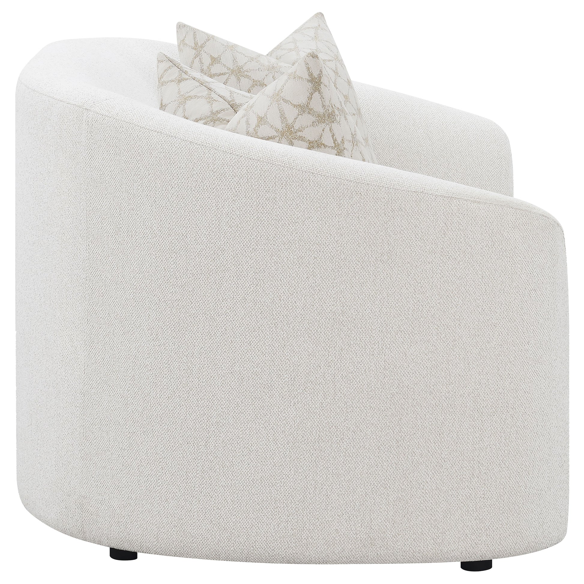 The living room set captures the perfect balance of modern warmth and sculptural design. Each piece is wrapped in soft latte boucle upholstery, creating a cozy yet elevated texture. Curved silhouettes and sloped armrests lend a contemporary feel, while plush cushions and tailored backs ensure enduring comfort. Accent pillows with faux down fill add inviting softness and refinement. Blending timeless craftsmanship with modern aesthetics, this collection transforms any living space into a serene and stylish retreat.