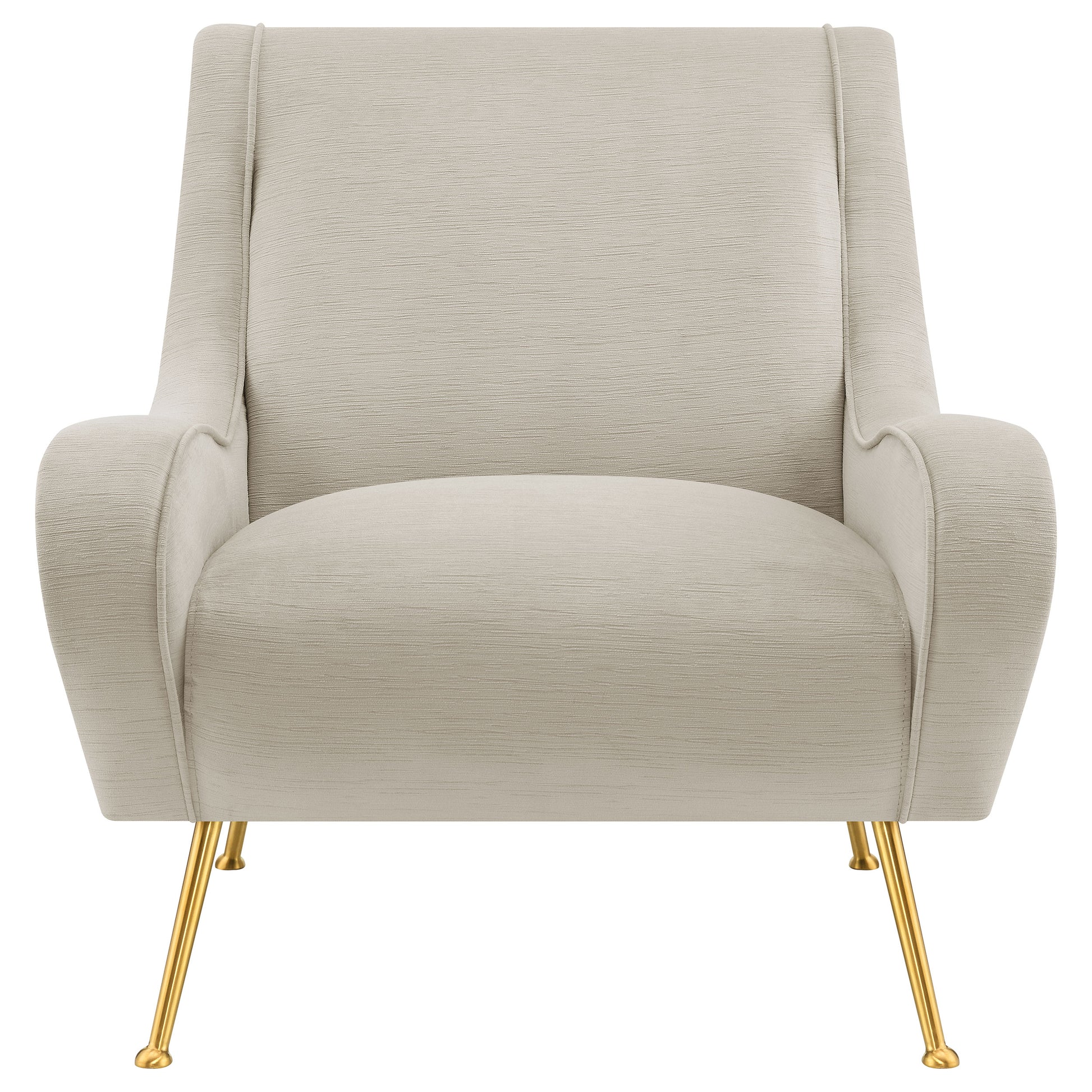 With a stylishly curvy silhouette, this accent chair offers an artisan approach to furnishings in your custom casual or semi-formal space. Embellish a living room or family room with a chic chair creating palette versatility and a romantic ambiance. Relax in style and beauty with a delicious design in seating, starting with plywood framing and soft textured velvet upholstery. Alluring flared silhouetting on its full-length armrests adds comfort in conjunction with an extra-wide build, as a comfy attached seat invites hours of pleasing leisure. Bring in a hint of retro style with slender, splayed gold metal legs and button caps that create a whimsical satellite effect.