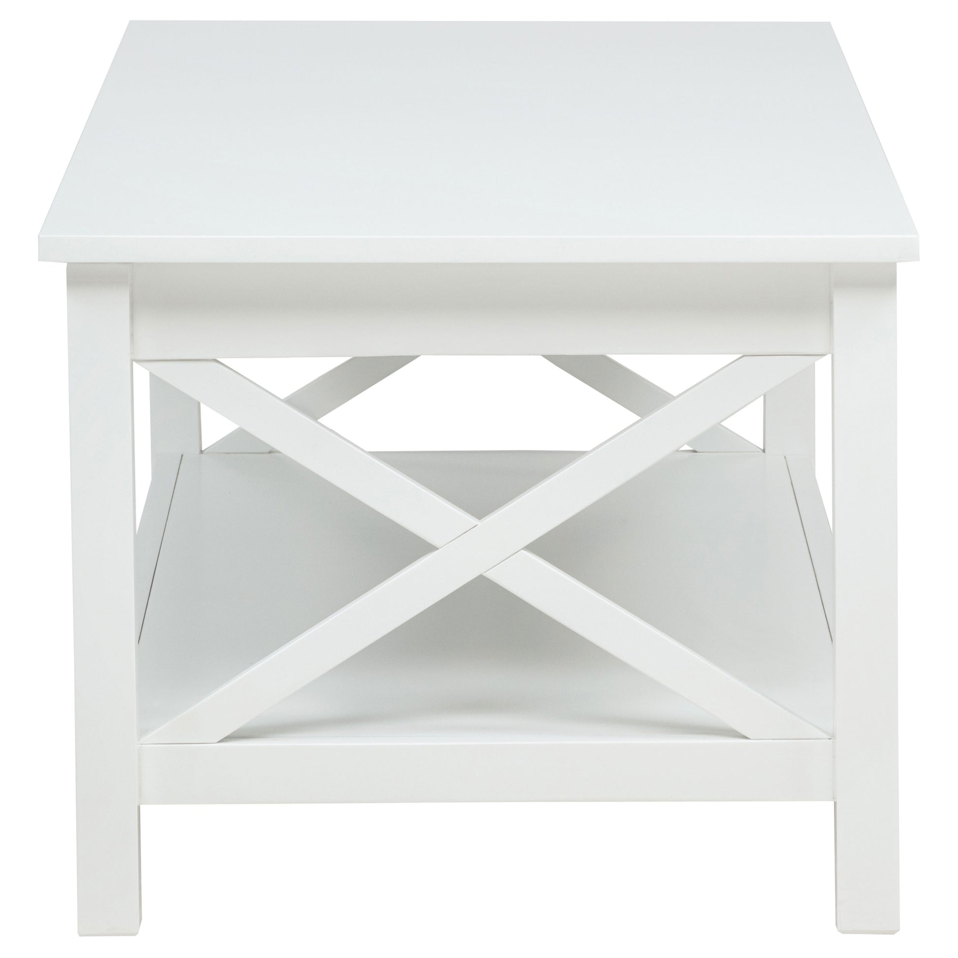 Blending clean lines with classic charm, this occasional table set offers timeless appeal with practical purpose. The lift-top coffee table features hidden storage and a rising surface for flexible use, while the matching end table provides open shelving and farmhouse-inspired X-frame sides. Finished in bright white and crafted from pine and engineered wood, this living room set brings fresh energy and functional design to everyday moments.