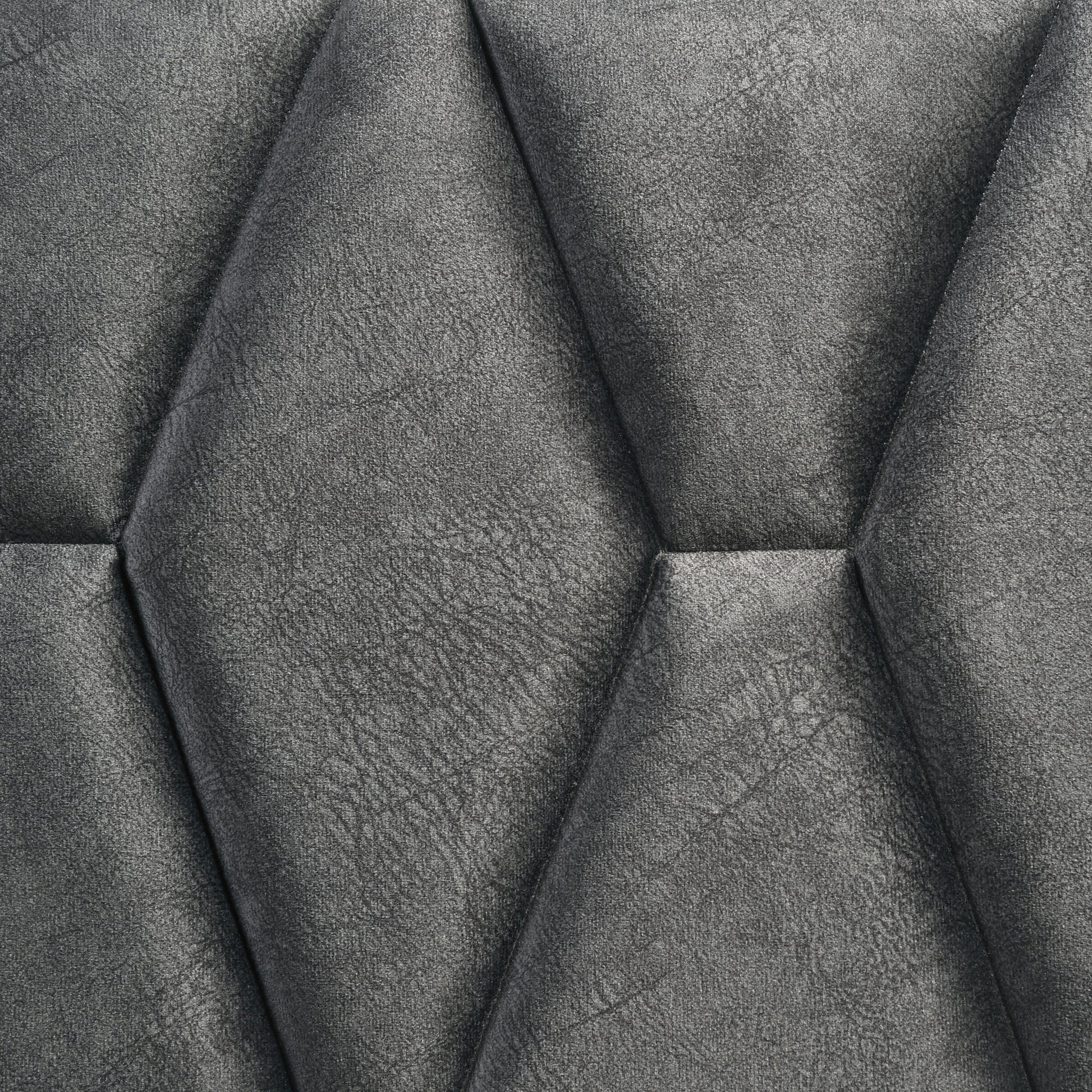 • Elongated hexagonal tufting creates a bold look in a padded headboard with dark gray fabric
