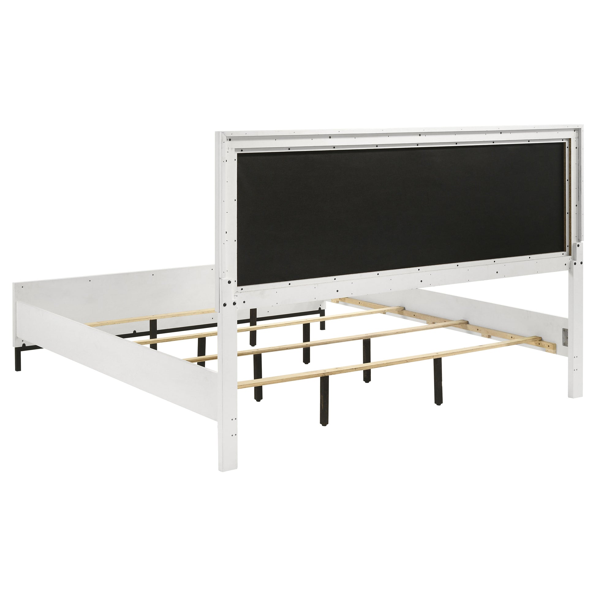 Bring geometric detail to your bedroom with the charming hexagon motif featured on this modern upholstered bed. Offering a contemporary look and feel, it creates a stylish focal point with its rich contrast of color and texture. The padded headboard offers excellent comfort and dark gray fabric upholstery. A streamlined wood frame adds a bright white finish to the rectangular head and footboards, creating an open, airy look. This stylish bed is complete with black accents in the base of the footboard and requires a foundation for use.